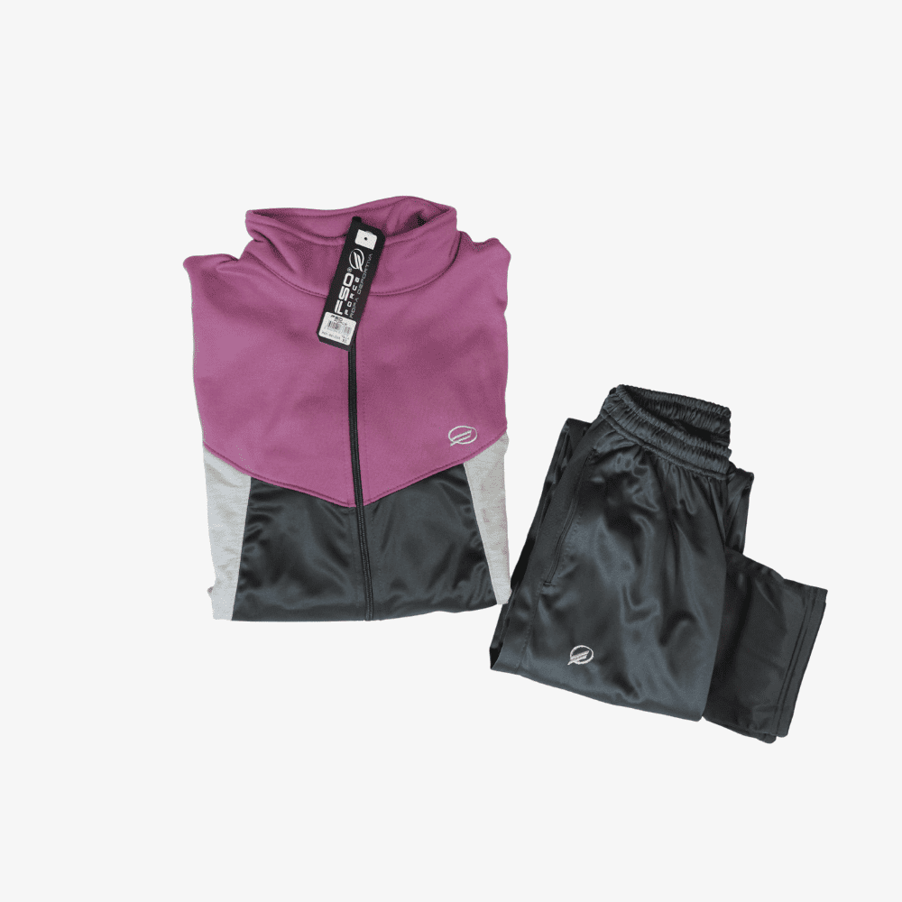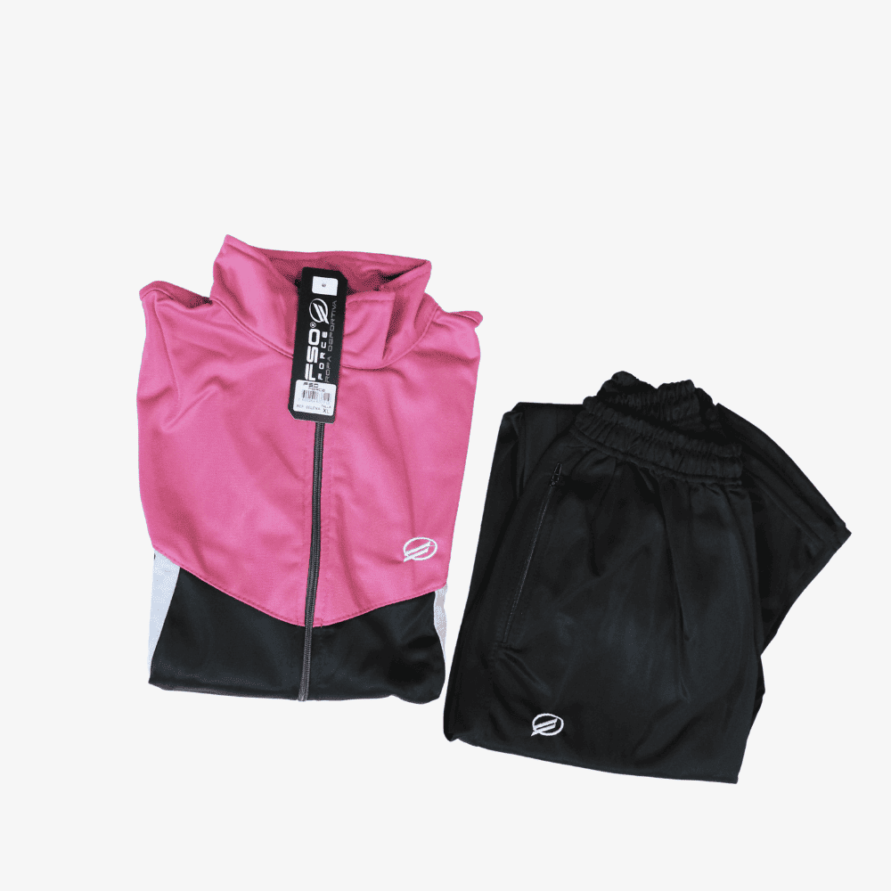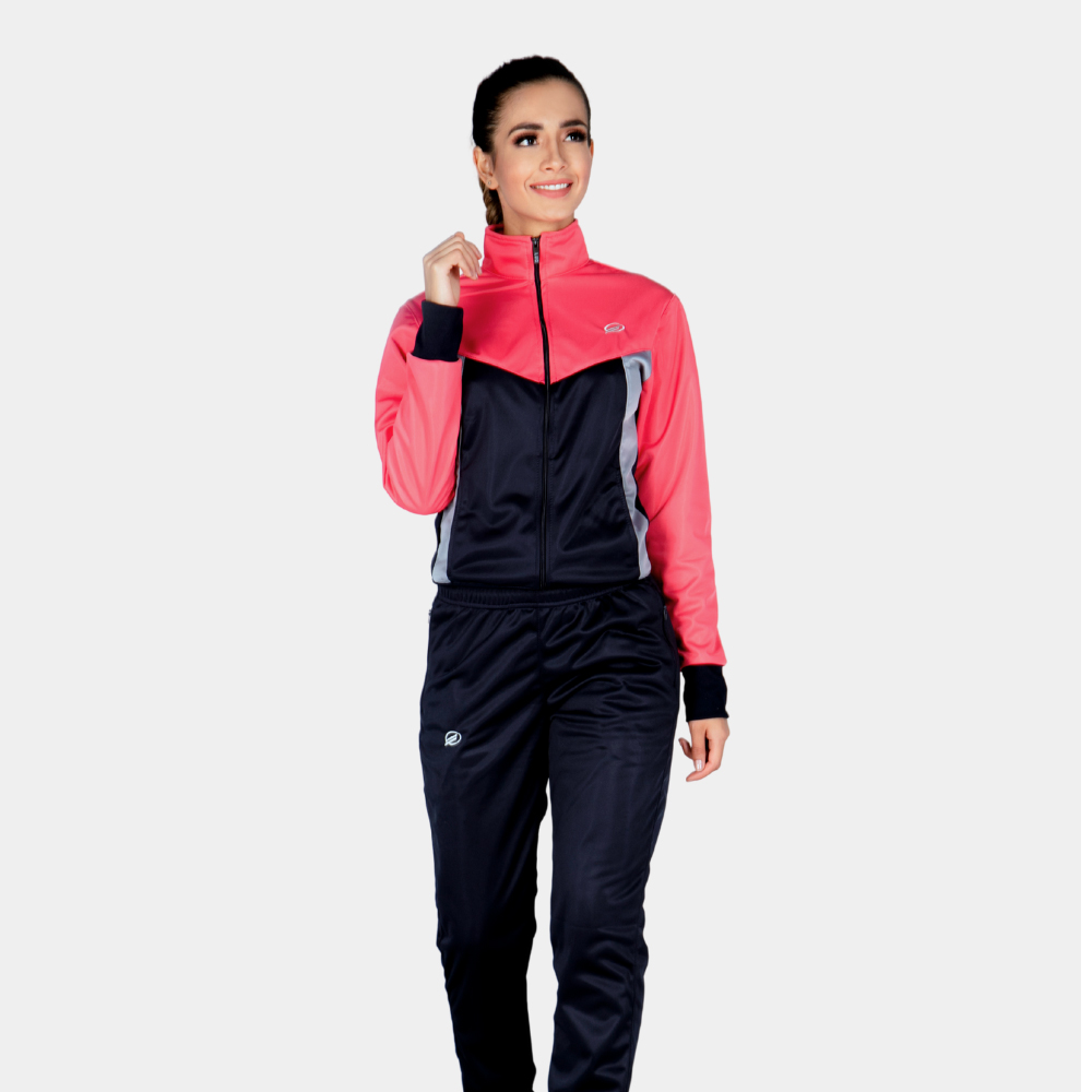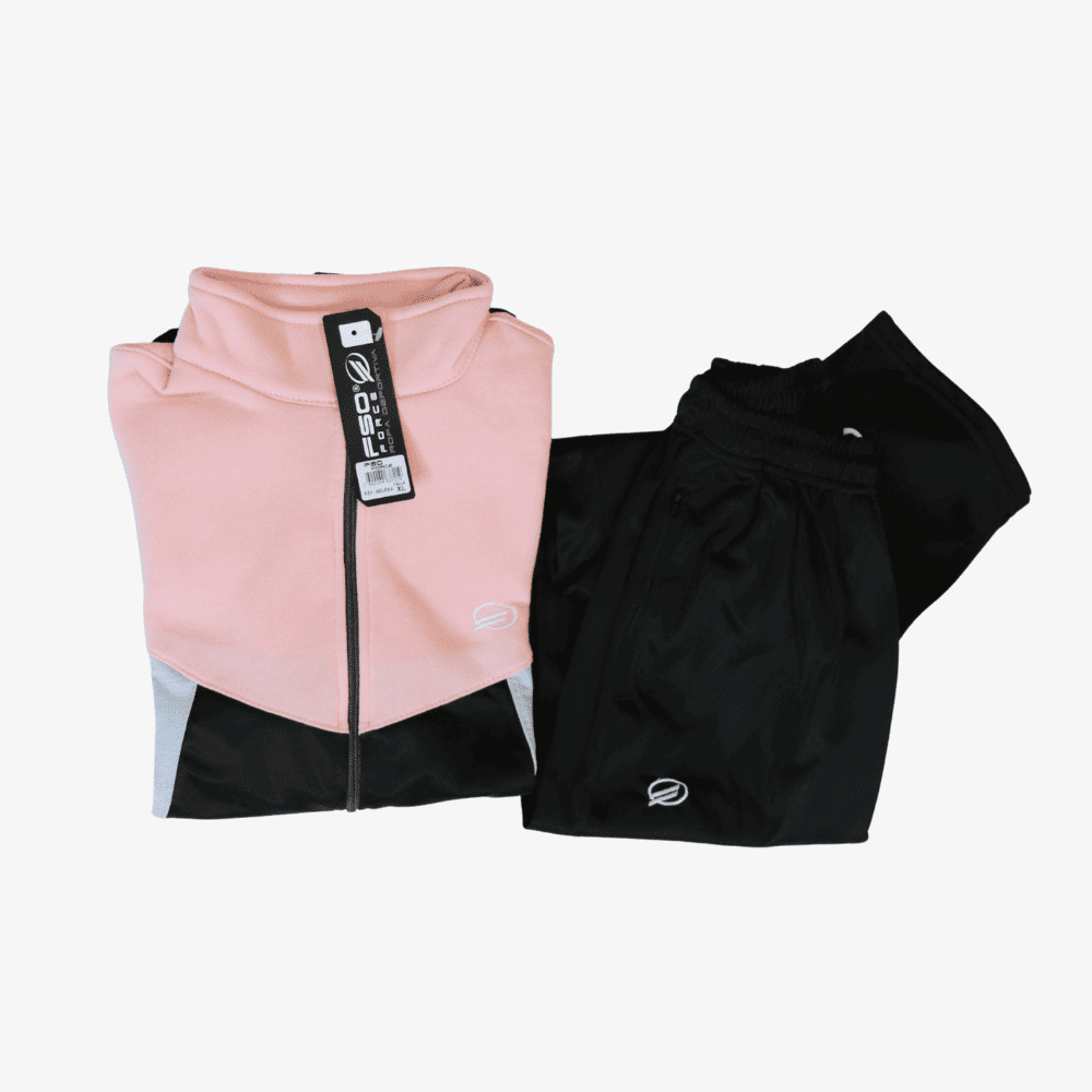 Sudadera sin capota combinado en nylon en colores tonos rosados y pasteles y sesgos de la misma manera bolsillos en la chaqueta tipo canguro pantalon clásico con sesgos de costado